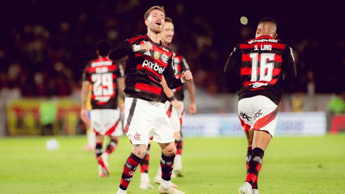 Três minutos depois, veio a resposta em grande estilo. Arrascaeta entregou na esquerda para Samuel Lino, que cruzou na medida para Léo Pereira, livre, cabecear no cantinho e abrir o placar.