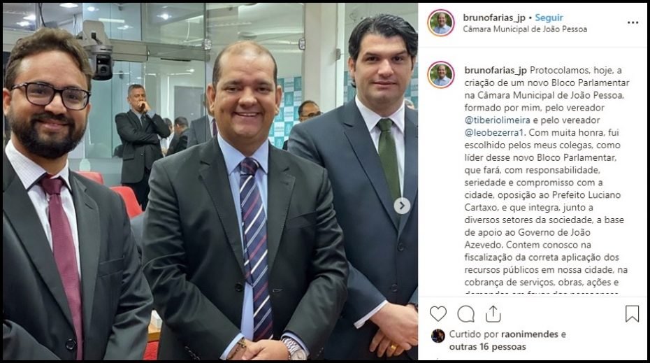 Protocolamos, hoje, a criação de um novo Bloco Parlamentar na Câmara Municipal de João Pessoa, formado por mim, pelo vereador Tibério Limeira e pelo vereador Leo Bezerra. Com muita honra, fui escolhido pelos meus colegas, como líder desse novo Bloco Parlamentar, que fará, com responsabilidade, seriedade e compromisso com a cidade, oposição ao Prefeito Luciano Cartaxo, e que integra, junto a diversos setores da sociedade, a base de apoio ao Governo de João Azevedo. Contem conosco na fiscalização da correta aplicação dos recursos públicos em nossa cidade, na cobrança de serviços, obras, ações e demandas em favor dos pessoenses, bem como na apresentação de ideias e sugestões que elevem a qualidade de vida em nossa Capital.