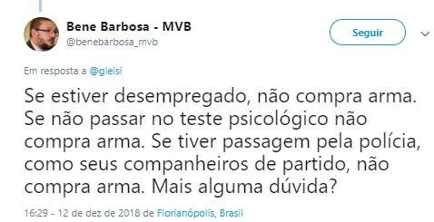 “Se estiver desempregado, não compra arma. Se não passar no teste psicológico não compra arma. Se tiver passagem pela polícia, como seus companheiros de partido, não compra arma. Mais alguma dúvida?”