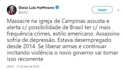 “Massacre na igreja de Campinas assusta e alerta com possibilidade de Brasil ter com mais frequência crimes, estilo americano. Assassino sofria de depressão. Estava desempregado desde 2014. Se liberar armas e continuar incitando violência o novo governo vai tornar isso recorrente.”