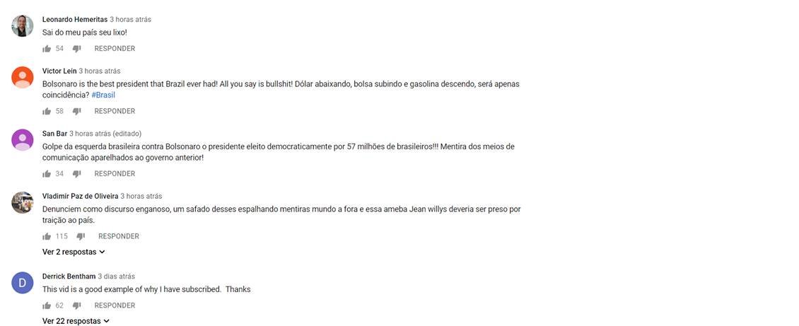 As infâmias lançadas por Greenwald receberam o imediato repúdio do povo brasileiro. Uma avalanche de ‘deslikes’ tomou conta do vídeo e uma série de comentários de internautas contestando a história criada pelo pilantra americano.