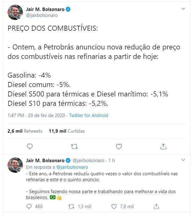 O presidente da República, Jair Messias Bolsonaro, anunciou através de suas redes sociais neste sábado, 29, que o preço do combustível baixou pela quinta vez consecutiva em 2020.