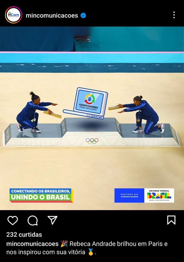 Uma nova publicação foi feita para deixar explícita a admiração que o Ministério das Comunicações tem por Rebeca Andrade e suas conquistas, que tanto representa para o país como uma mulher preta medalhista olímpica. O Ministério das Comunicações reverencia Rebeca Andrade. Ela não só entrou para a nossa história, ela é a nossa história.“
