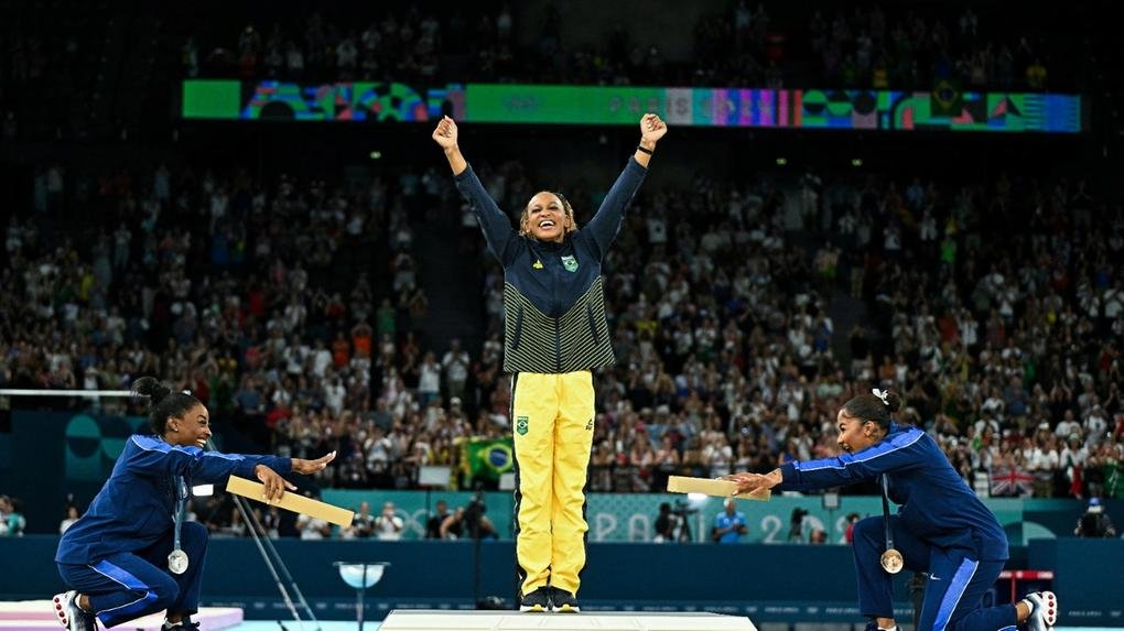 Na foto original, Rebeca aparece no topo do pódio após ganhar medalha de ouro pelo desempenho no solo de ginástica artística e sendo reverenciada pelas atletas Simone Biles e Jordan Chiles.