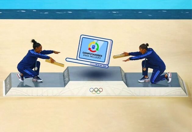 Na foto original, Rebeca aparece no topo do pódio após ganhar medalha de ouro pelo desempenho no solo de ginástica artística e sendo reverenciada pelas atletas Simone Biles e Jordan Chiles.