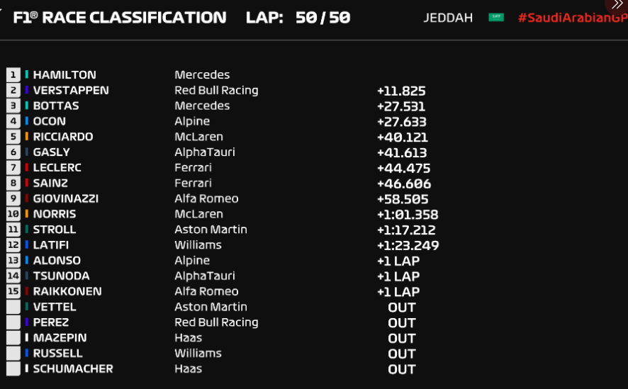 O inglês Lewis Hamilton, da Mercedes, venceu um polêmico e conturbado Grande Prêmio da Arábia Saudita neste domingo (05), no circuito de Jeddah, e alcançou Max Verstappen (Red Bull), segundo colocado na prova, na liderança do Mundial de Fórmula 1 a uma etapa do fim.