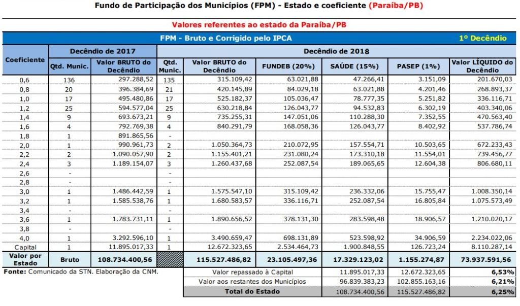 O primeiro decêndio de abril do Fundo de Participação dos Municípios (FPF) será depositado nas contas das prefeituras paraibanas nesta terça-feira (10). A Confederação Nacional de Municípios (CNM) prevê a partilha de R$ 115.527.486,82 em valores brutos. Quando descontados os valores obrigatórios do Fundo Nacional de Desenvolvimento da Educação (Fundeb) e da área da Saúde, as cidades receberão R$ 73.937.591,56.