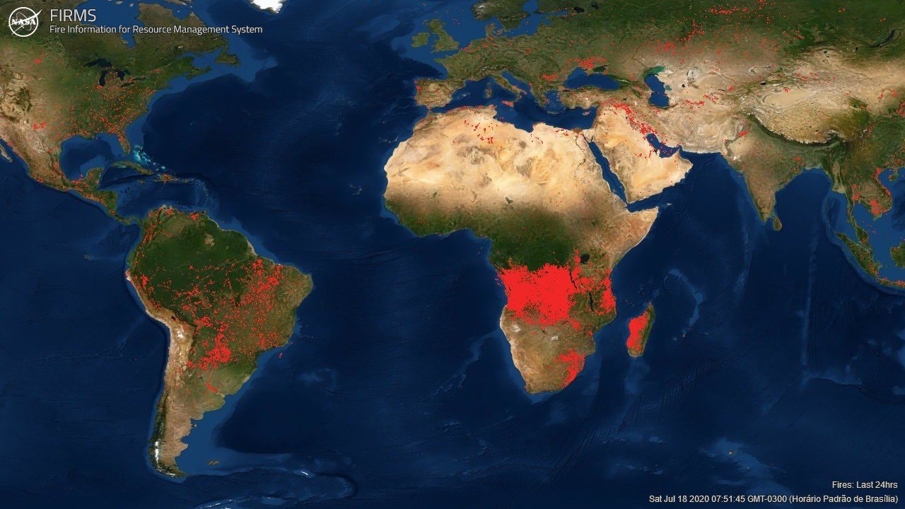 Uma imagem de 18 de julho, emitida pelo Fire Information for Resource Management System (Firms) do Earth System Data (Esdis) da Nasa, mostra os focos de fogo ativos na vegetação do mundo nas 24 horas anteriores. Como se pode constatar, os incêndios registrados no Brasil perdem para os da Argentina e nem se comparam com os que consomem a segunda maior floresta tropical do mundo, a da Bacia do Congo, e a Ilha de Madagascar, ambas na África.