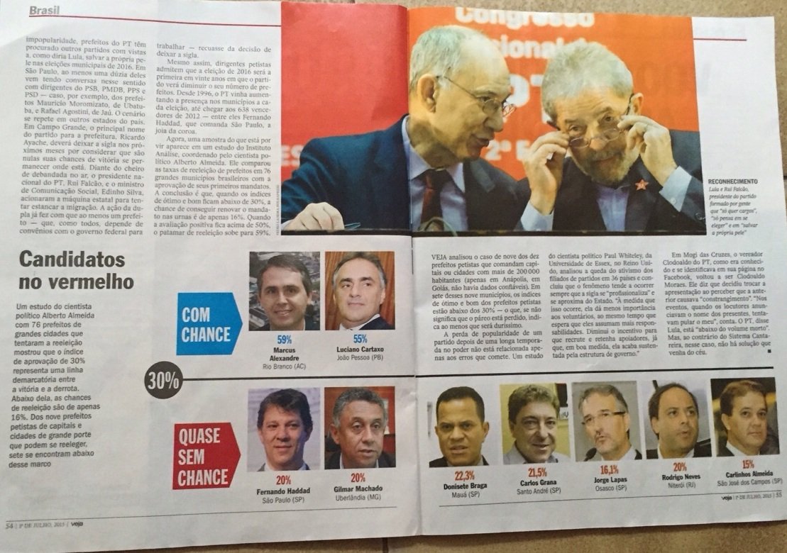 A reportagem levou em consideração prefeitos de 76 municípios brasileiros que pretendem disputar a reeleição. Dos nove prefeitos petistas avaliados, apenas Luciano Cartaxo e Marcus Alexandre, de Rio Branco, no Acre, estariam bem acima dos 30% de aprovação em suas gestões. Os demais não chegaram sequer aos 23%. (com Veja)