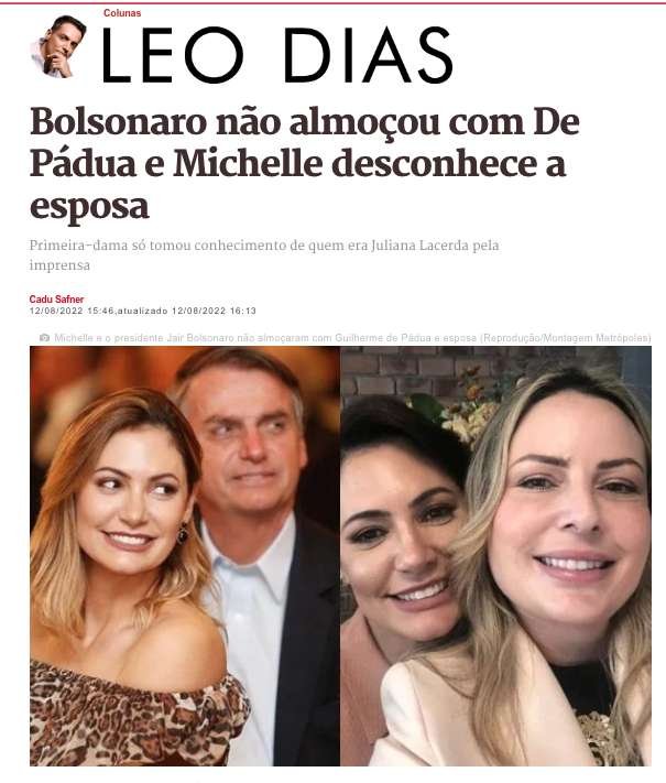 “Das informações propagadas sobre o presidente Jair Bolsonaro (PL) e a primeira-dama, Michelle Bolsonaro, terem almoçado com Guilherme de Pádua (assassino de Daniella Perez) e sua esposa Juliana Lacerda, nenhuma procede. Foram cerca de 300 pessoas neste almoço que aconteceu em um restaurante em Belo Horizonte (MG), no domingo (7/8), e sequer teve a participação de Bolsonaro”.