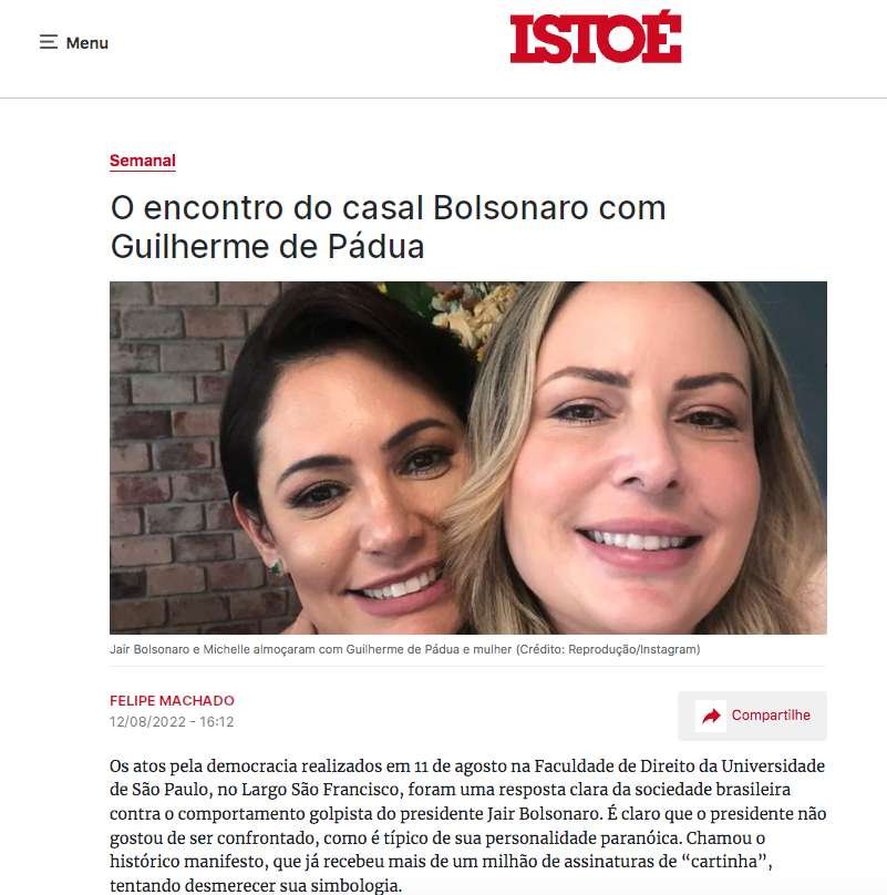Segundo matéria do jornalista Felipe Machado da IstoÉ, o presidente Jair Bolsonaro e a primeira-dama teriam se encontrado com o ex-ator Guilherme de Pádua.