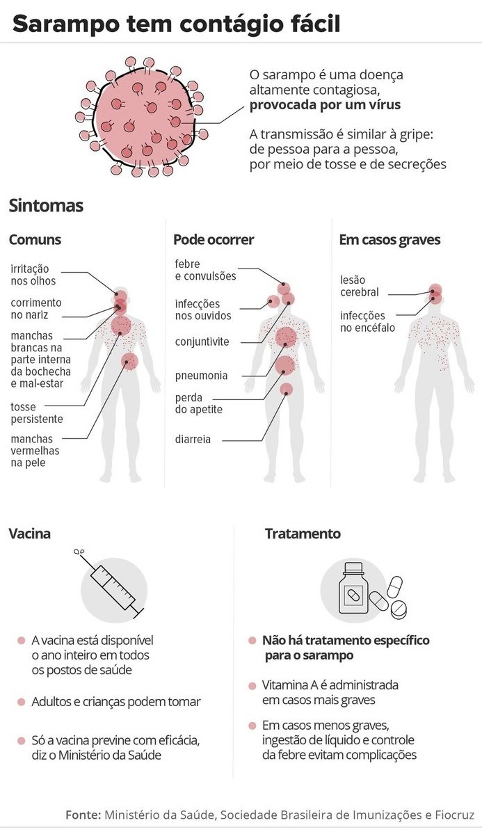 Sintomas – Os sintomas iniciais de sarampo são, de acordo com a Secretaria, febre acompanhada de tosse persistente, irritação nos olhos, coriza e congestão nasal e mal-estar intenso. Após isso, há o aparecimento de manchas avermelhadas no rosto, que progridem em direção aos pés, com duração mínima de três dias. Também são comuns lesões muito dolorosas na boca.