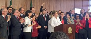 Cercada por dezenas de ex-ministros, parlamentares e servidores do Palácio do Planalto, a presidenta afastada Dilma Rousseff faz neste momento um pronunciamento à imprensa em que classificou o processo contra ela de “impeachment fraudulento”.