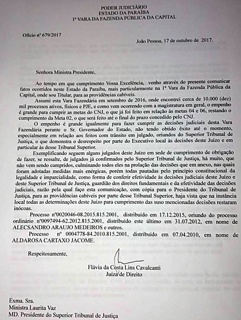 A juíza Flávia da Costa Lins Cavalcanti, titular da 1ª Vara da Fazenda Pública de João Pessoa, enviou um ofício à presidência do Superior Tribunal de Justiça (STJ) comunicando que o governador da Paraíba Ricardo Coutinho não tem cumprido decisões do tribunal. O ofício foi endereçado à ministra presidente Laurita Vaz no dia 17 de outubro.