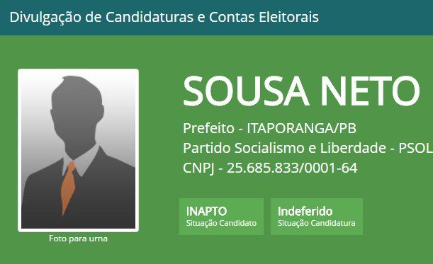 A Justiça Eleitoral indeferiu o registro de candidatura de José Francisco de Sousa Neto (PSOL) que pleiteava disputar o mandato de prefeito de Itaporanga, no Sertão da Paraíba. Ele poderá recorrer da decisão ao Tribunal Regional Eleitoral (TRE).