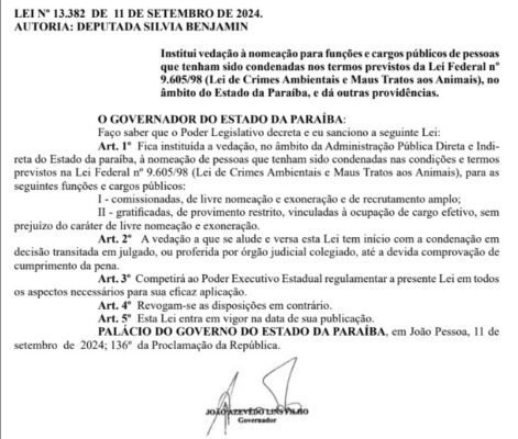 A lei de autoria da deputada Silvia Benjamin, veda à nomeação, no âmbito da Administração Pública Direta e Indireta do Estado da paraíba, de pessoas que tenham sido condenadas na Lei de Crimes Ambientais e Maus Tratos aos Animais.