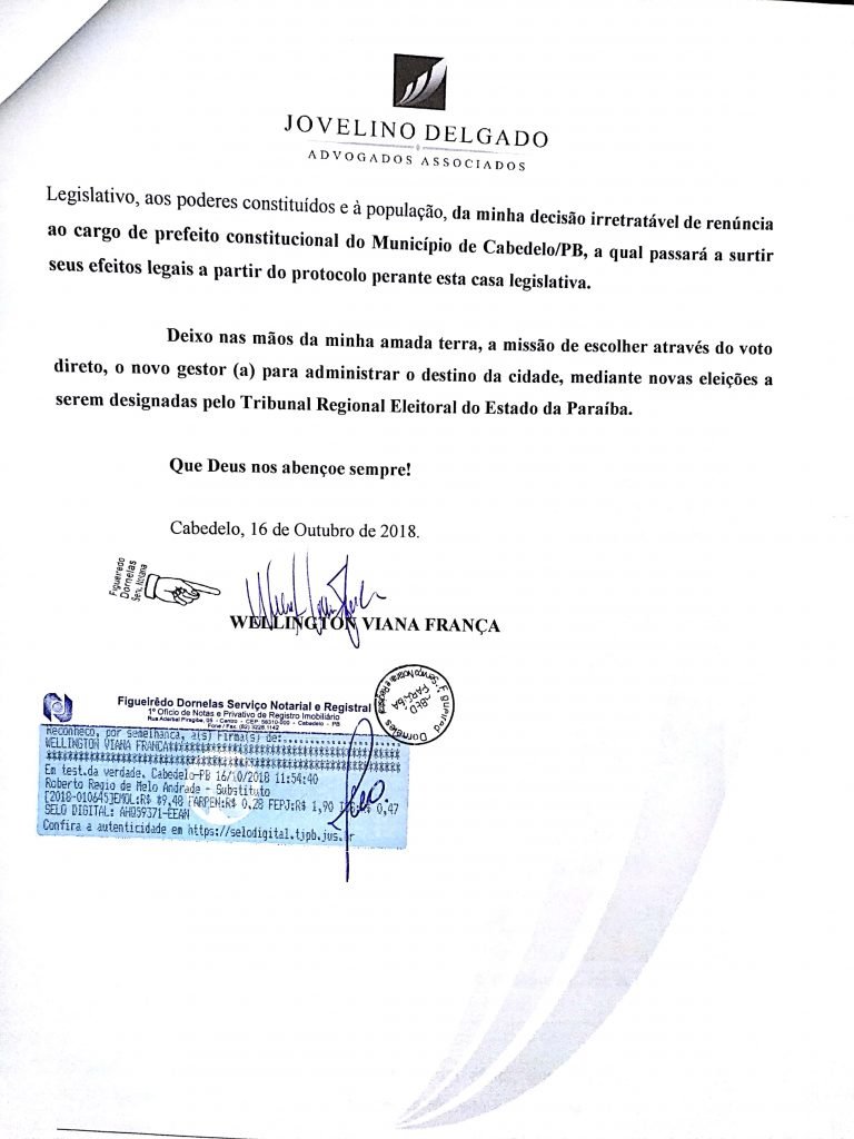 A carta-renúncia foi protocolada pelo advogado de Leto, Jovelino Delgado, na Câmara Municipal. A decisão tem duas consequências jurídicas imediatas. A primeira é que o Legislativo terá que oficiar a Justiça Eleitoral sobre a renúncia. Isso abrirá espaço para a convocação de novas eleições no município. Este ponto, inclusive, foi apontado como crucial para a decisão do gestor, segundo relato da defesa dele no caso. Atualmente tramita na Câmara Municipal uma comissão processante que pede a cassação do mandato do gestor afastado.
