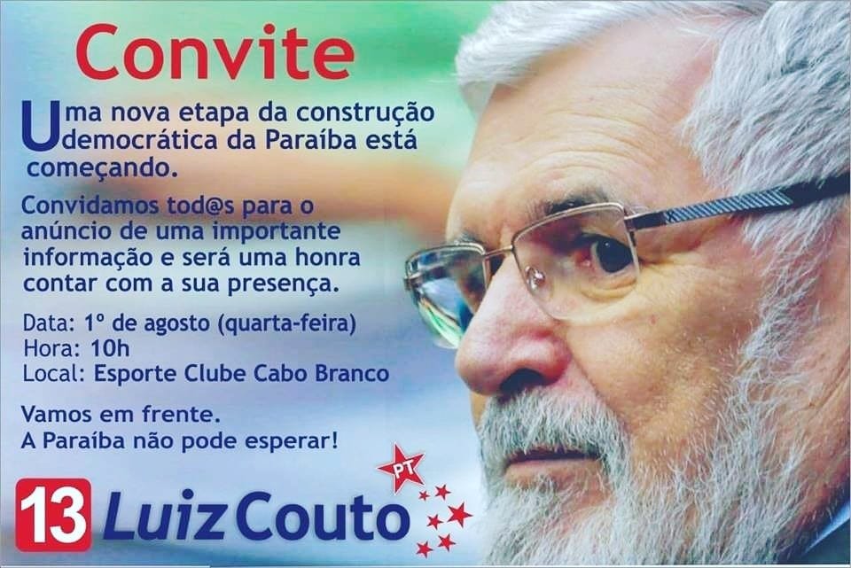 Será hoje, quarta-feira (01), às 10hs, no Esporte Clube Cabo Branco, o anúncio do deputado federal Luiz Couto (PT) para consolidar sua pré-candidatura ao Senado Federal na chapa que será encabeçada pelo ex-secretário João Azevêdo (PSB). A expectativa é que a presidente nacional do PT, Gleisi Hoffman, também compareça ao evento.