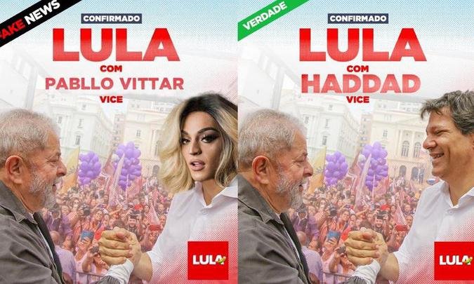 O desmentido da “fake news” foi divulgado na noite dessa segunda-feira (6) no Twitter oficial de Lula. “Está circulando essa imagem na rede então vamos explicar: o vice de Lula é Fernando Haddad e não Pabllo Vittar, pessoal”, informou o perfil, com as hashtags “o Brasil feliz de novo” e “time Lula.