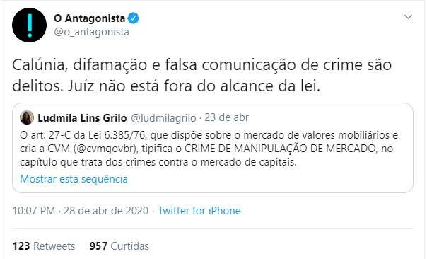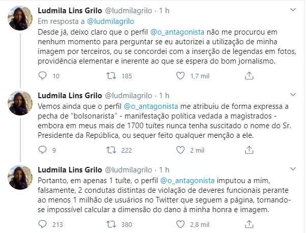 Nesta quartafeira, 29, a juíza Ludmila Lins Grilo, rebateu publicações ‘caluniosas’ do site de notícias ‘O Antagonista’ e escancarou as ‘mentiras’ e possíveis crimes cometidos pelo site de Diogo Mainardi.