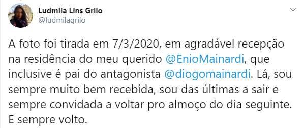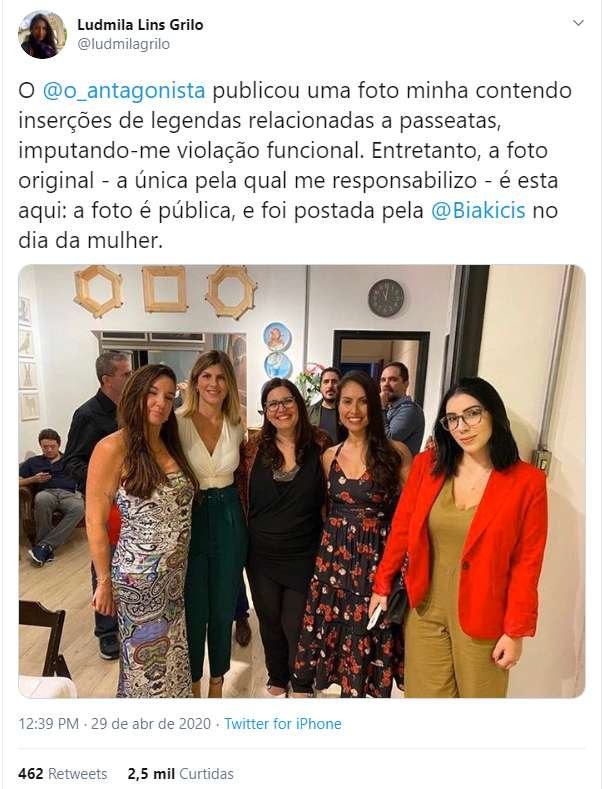 “O ‘O Antagonista’ publicou uma foto minha contendo inserções de legendas relacionadas a passeatas, imputandome violação funcional. Entretanto, a foto original a única pela qual me responsabilizo é esta aqui: a foto é pública, e foi postada pela Bia Kicis no dia da mulher” , disse Ludmila.