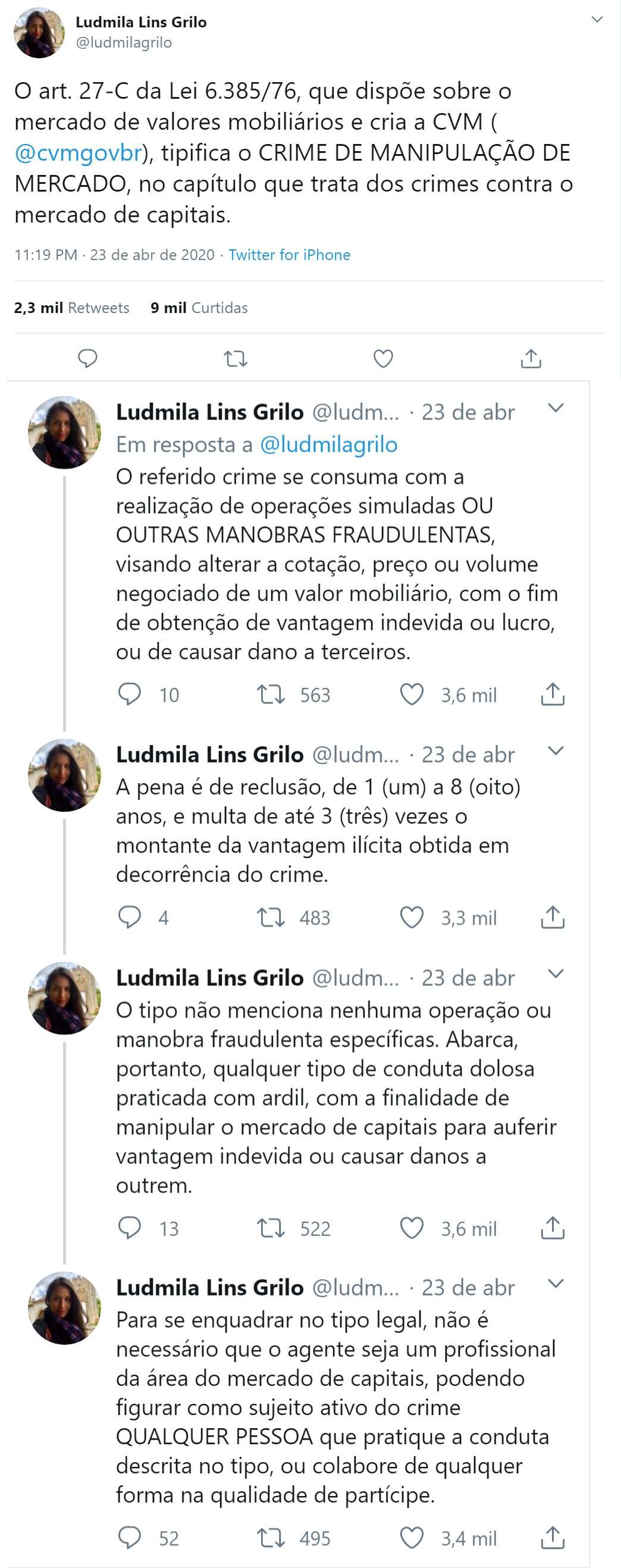 “O referido crime se consuma com a realização de operações simuladas OU OUTRAS MANOBRAS FRAUDULENTAS, visando alterar a cotação, preço ou volume negociado de um valor mobiliário, com o fim de obtenção de vantagem indevida ou lucro, ou de causar dano a terceiros” , escreveu Ludmila.