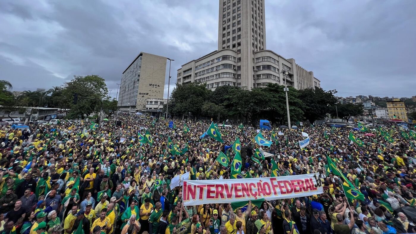 Vestidos de verde e amarelo, os manifestantes pedem “intervenção federal” por entenderem que o processo eleitoral não foi conduzido de maneira justa.