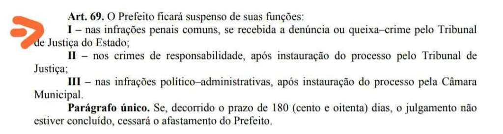 Dentre as modificações propostas a que chama mais atenção diz respeito à nova redação que se pretende dar ao inciso I do art. 69, que passará a admitir o afastamento das funções do prefeito, apenas no caso de recebimento de uma denuncia pelo Tribunal de Justiça por crime cometido no exercício da própria função de Prefeito.