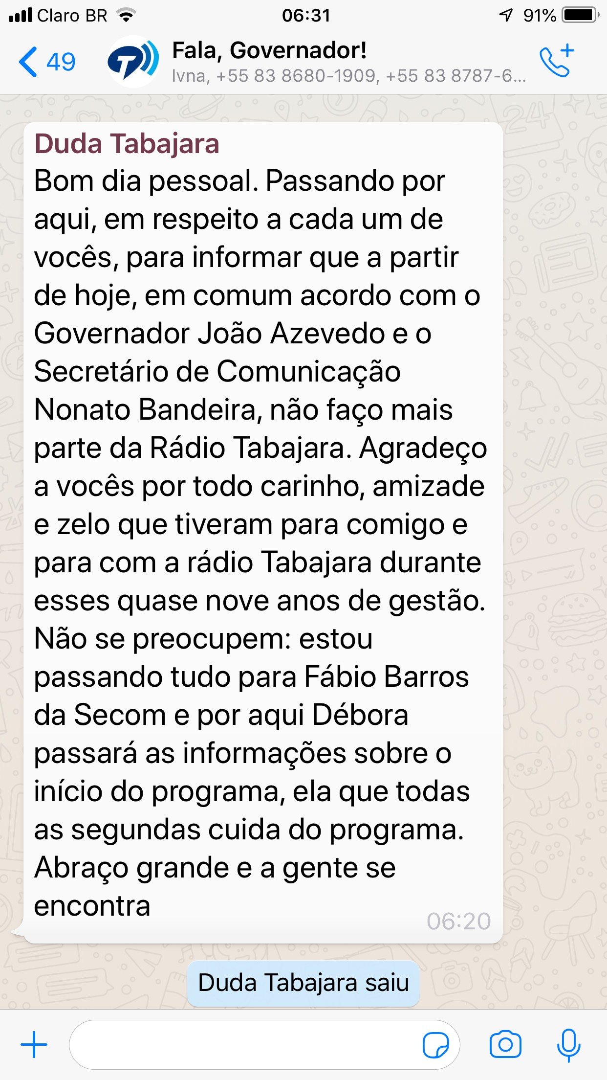 Abaixo, a informação postada por Maria Eduarda em um grupo de WhatsApp do “Fala, Governador!”