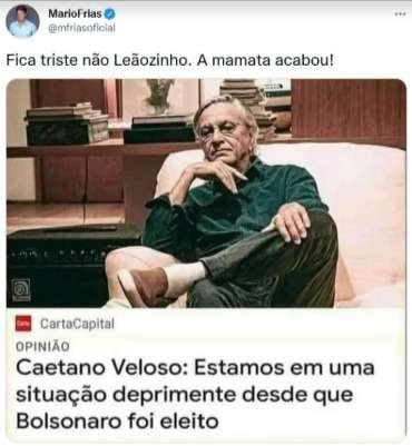 Frias compartilhou a entrevista e ironizou o lamento do cantor, citando um trecho de uma música de Veloso: