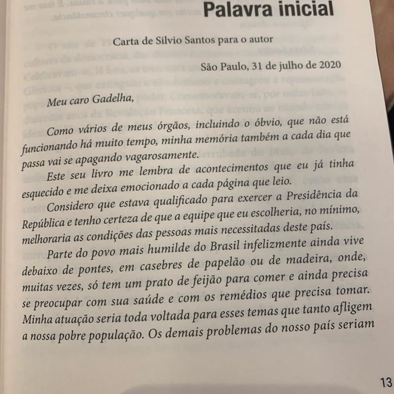 Familiares de Silvio Santos divulgaram uma carta nesta semana, escrita pelo apresentador para o prefácio do livro “Sonho Sequestrado”, de Marcondes Gadelha. A obra aborda a corrida de Silvio, com Gadelha como vice, às eleições presidenciais de 1989. Na carta, com data de 31 de julho de 2020, o dono do SBT se mostra saudoso.
