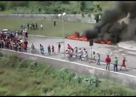 Os moradores queimaram pneus próximo ao local onde está instalada a fábrica. De acordo com os moradores no local, existe um descarte irregular do cimento que não é mais utilizado pela fábrica.