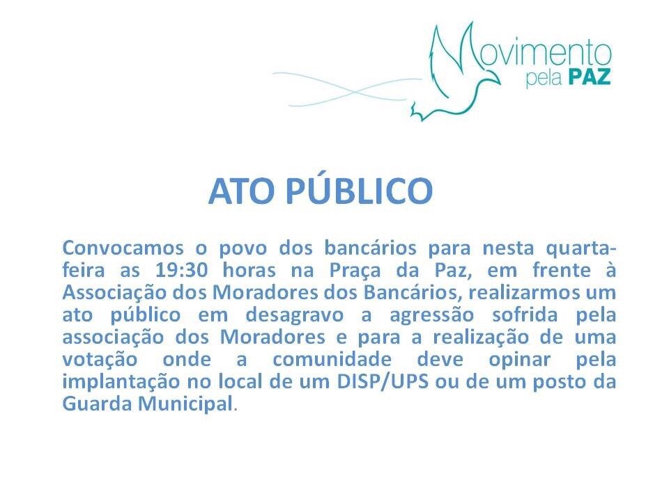 Os moradores do bairro dos Bancários, em João Pessoa, vão se reunir nesta quarta-feira, 08, para reivindicar a instalação de um Departamento Integrado de Segurança Pública na sede da Associação de Moradores, próximo à Praça da Paz. Segundo o ‘Movimento de Paz’, é importante ouvir as pessoas sobre a prioridade de ter um DISP ou uma base da guarda municipal.