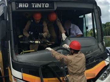 O motorista de um ônibus intermunicipal ficou preso nas ferragens do veículo após bater em um caminhão, no início da tarde desta quinta-feira (7), na Via Oeste, em João Pessoa. Ele precisou de auxílio de bombeiros militares para sair do veículo, mas passa bem.