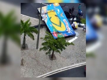 A vítima que permanece no Hospital de Trauma, de 51 anos, caminhava na avenida Brasília, no bairro do Mirante, quando um outdoor caiu sobre um carro e acabou sendo atingida.