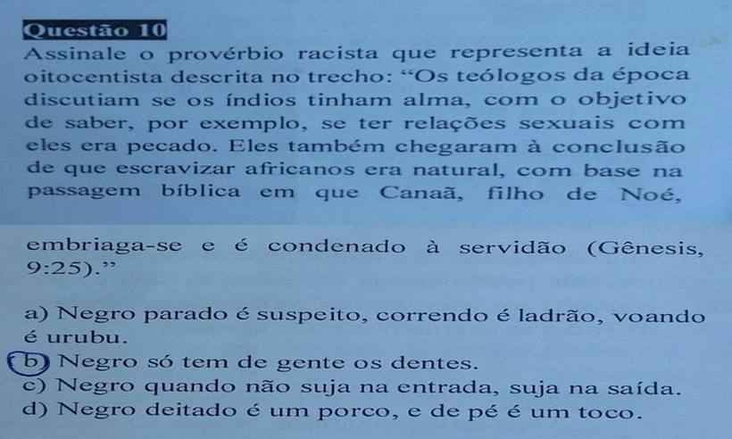 Na prova de conhecimentos gerais, foi apresentada uma pergunta “Qual a origem do racismo?”. Na sequência, foi transcrita a passagem bíblica (Gênesis 9:25) em que estaria subentendida a origem do preconceito racial contra o negro. No trecho, Canaã, filho de Noé, se embriaga e é condenado a servir como escravo. O candidato foi então orientado, a assinalar a alternativa que conteria o provérbio racista presente na publicação. Entre as opções de respostas: a) “negro parado é suspeito, correndo é ladrão, voando é urubu”; b) “negro só tem de gente os dentes”, c) “negro quando não suja na entrada, suja na saída”; d) “negro deitado é um porco, e de pé um toco”. A alternativa correta para a questão seria o provérbio “negro só tem de gente os dentes”.