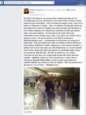 “Peço desculpas hoje a 300 convidados, a minha família, aos meus amigos, a minha avó Alzira e Dilma, pois o circo estava montado e o palhaço todo mundo hoje sabe quem é?Eu literalmente vi o mundo desabar sobre minha cabeça. Dói saber que apenas fui usada. Meu irmão estava me levando ao altar tão feliz…Eu não sei quando eu vou voltar a sorrir,mas sei que Deus fez Justiça, nada escapa das mãos dele, nem ninguém… Agradeço a Deus por todos aqueles que o senhor tirou a máscara, a delegada Tatiana Matos e a toda a polícia, que fizeram um excelente trabalho…Não sei quando, nem o dia, mas eu vou ser feliz….Obrigada Jesus…”