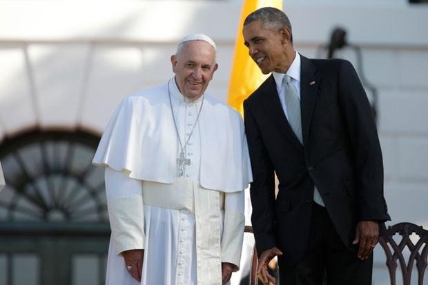 Papa Francisco é recebido pelo presidente dos EUa, Barack Obama, na Casa Branca nesta quarta-feira (23) (Foto: Pablo Martinez Monsivais/AP)“Nós apoiamos seu pedido a todos os líderes mundiais para apoiarem as comunidades mais vulneráveis às mudanças climáticas e nos juntamos para preservar nosso precioso mundo para as futuras gerações. ”