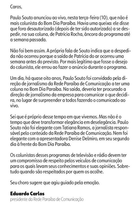 O presidente da Rede Paraíba de Comunicação, executivo Eduardo Carlos, soltou uma nota no início da noite desta terça-feira, 10, considerando deselegante a atitude do advogado Paulo Souto que anunciou, ao vivo, emocionado, a decisão de não mais colaborar com a emissora, como colunista do quadro “Eu Quero Saber”, no programa jornalístico Bom dia Paraíba, da afiliada da Rede Globo de Televisão em João Pessoa, a TV Cabo Branco.