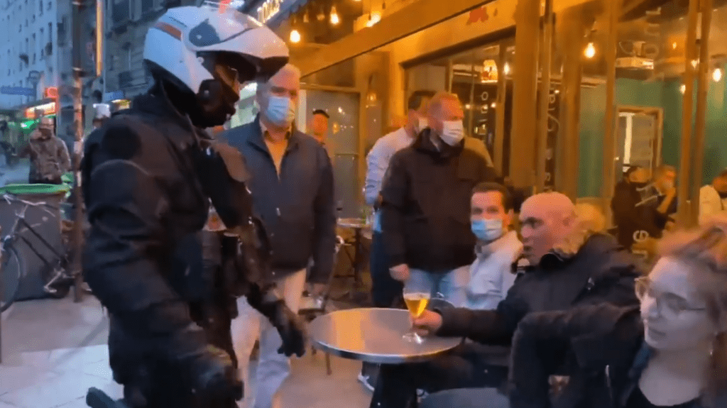“Saiam daqui”, ordena o policial a clientes sentados nas mesas da calçada de um restaurante em Paris, na França. Visivelmente desconcertados, homens e mulheres olham atônitos sem saber como agir. Um deles tenta argumentar que está bebendo e por isso não usa a máscara de proteção, guardada em seu bolso.