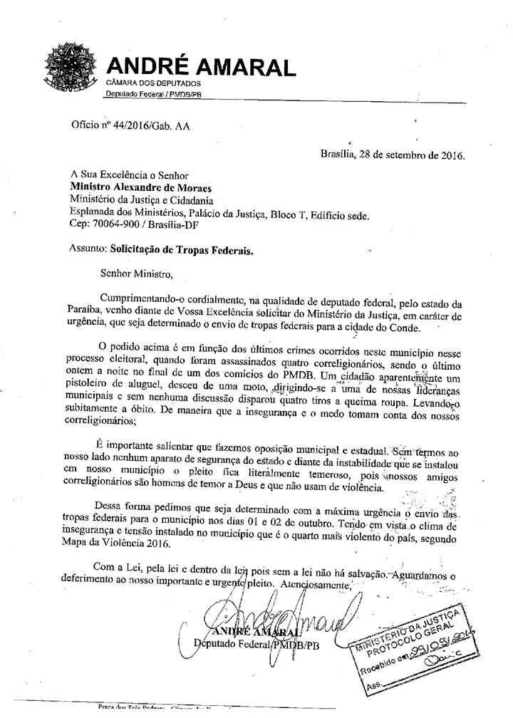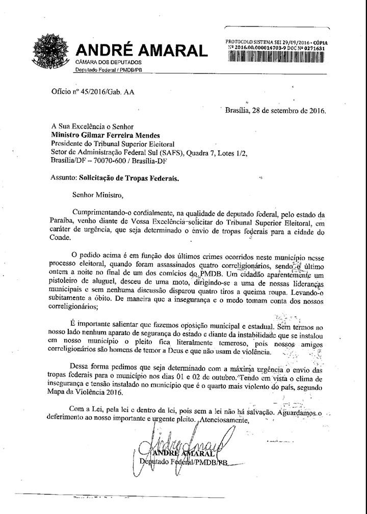 No dia 28 de setembro, o Dep. Federal André Amaral, solicitou em “caráter de urgência” ao Ministério da Justiça e ao Tribunal Superior Eleitoral, o envio de Tropas Federais para garantir a segurança da população nas eleições municipais da cidade do Conde-PB.