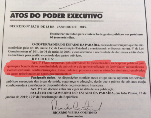 O governo do Estado publicou um decreto no Diário Oficial da Paraíba vetando os gastos com patrocínios ou apoio as festividades carnavalescas. A medida visa cortar gastos da máquina e foi publicada nesta quarta (14).