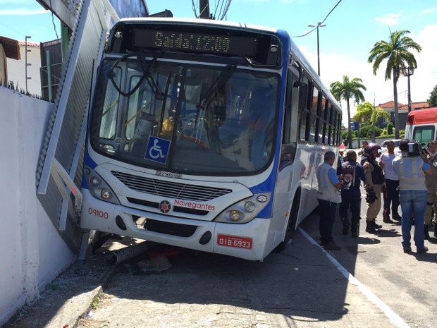 Falha mecânica no veículo teria provocado o acidente, segundo bombeiros. Parada de ônibus foi derrubada após colisão no Centro da cidade.