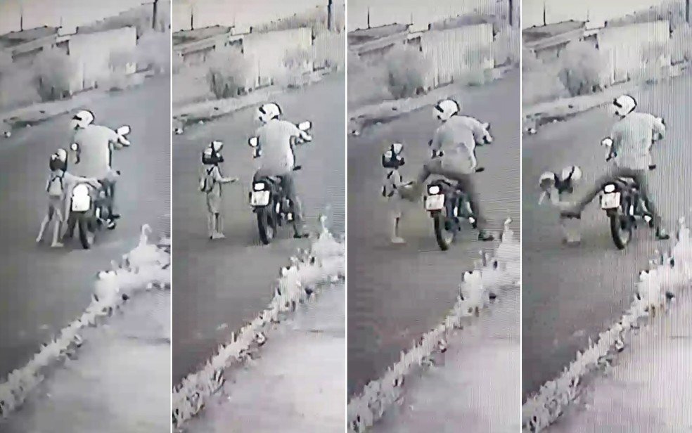 No vídeo, o jovem e a criança estão sobre uma moto parada. Usando capacete e com uma mochila nas costas, o menino desce e é agredido com um chute no peito pelo padrasto, que continua no veículo. Com o impacto, o garoto é jogado no asfalto e cai sentado. Logo depois, ele se levanta e sobe na moto novamente. Os dois deixam o local.