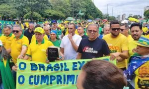 Manifestantes se reuniram neste domingo (18), no Centro de Brasília, contra movimentos do Judiciário, em especial ao ministro Alexandre de Moraes (STF),...