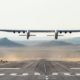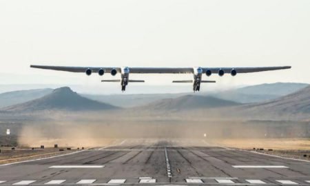 O maior avião do mundo em envergadura voou neste sábado (13) pela primeira vez sobre o deserto de Mojave, na Califória (EUA)....