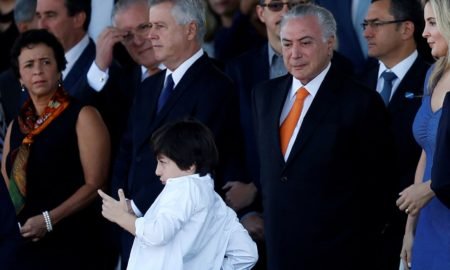 O filho do presidente Michel Temer, Michelzinho, de 9 anos, fez gestos com as mãos imitando uma arma durante o desfile de...