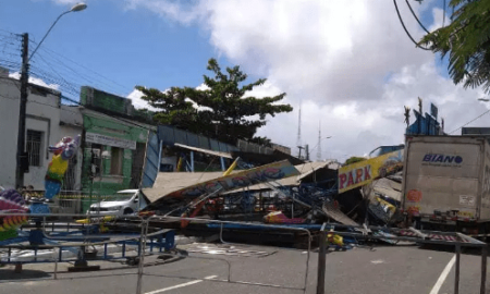 Parte da estrutura de um brinquedo do Parque de Diversão instalado para a Festa das Neves desabou na manhã desta segunda-feira (30)...