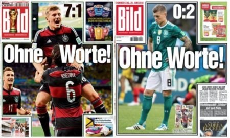 A eliminação da Alemanha na primeira fase da Copa do Mundo da Rússia fez o jornal alemão Bild reeditar a manchete do dia...