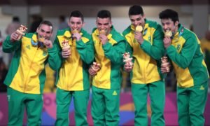 Quando a equipe americana seguiu para a disputa das argolas, o gesto foi institivo. Nas arquibancadas, o time brasileiro pegou o celular...